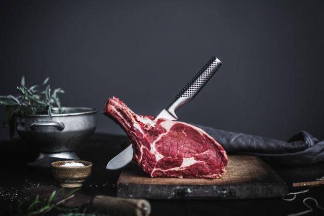 Globals slagterkniv er det naturlige valg, når du skal skære store stykker. Knivbladet, der vender opad gør det nemt at skære rundt om sener og brusk.