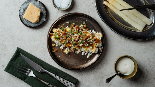 Aspargessæson! Denne opskrift på hvide asparges kommer fra den finske Michelin-kok Mikko Pakola. Serveres med kogt æg, frisk persille, smørstegte brødkrummer og en creme på vesterhavsost.
